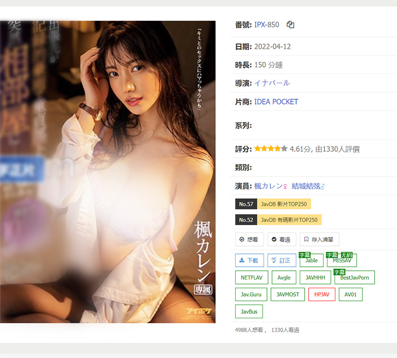 大部分影片都有在线观看,可能部分网站需要科学上网![]() 点击安装: https://sleazyfork.org/zh-CN/scripts/429173-jav-%E6%B7%BB%E5%8A%A0%E8%B7%B3%E8%BD%AC%E5%9C%A8%E7%BA%BF%E8%A7%82%E7%9C%8B |